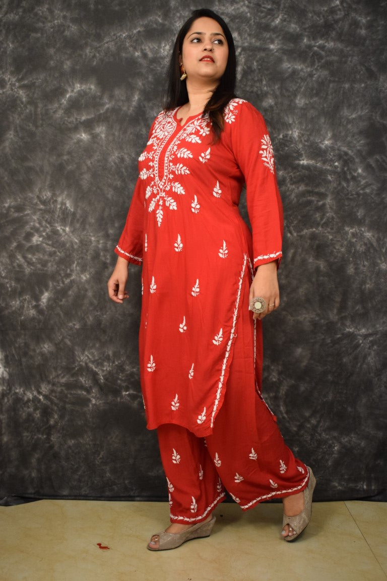 Red Dobby Cotton Short Kurti with Chikankari Hand Embroidery (Copy)