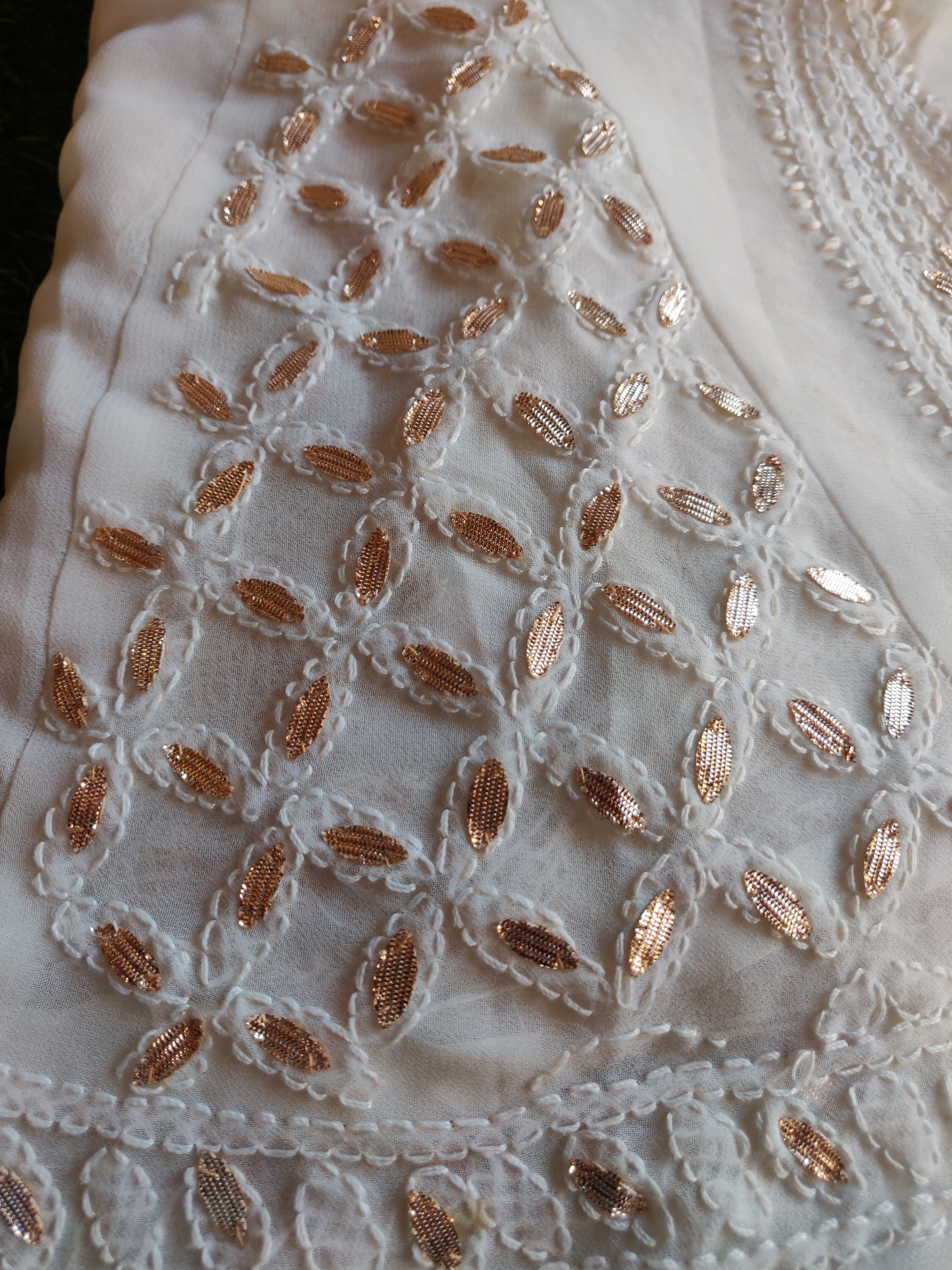 Step into elegance with our Georgette Sharara-Style Palazzo, exquisitely adorned with handcrafted Chikankari embroidery and gota patti work. Designed to offer a regal yet effortless charm, this piece blends traditional craftsmanship with contemporary flair, making it a must-have for any wardrobe.