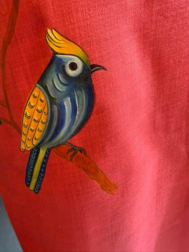 Let your style take flight with GulMor — a soft, pink slub cotton co-ord set adorned with a stunning hand-painted bird motif that adds an artisanal touch to your everyday fashion.