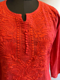 Bright, breezy, and beautifully detailed — this Red short kurti in soft dobby cotton is elevated with intricate Chikankari hand embroidery, blending everyday comfort with timeless elegance.
