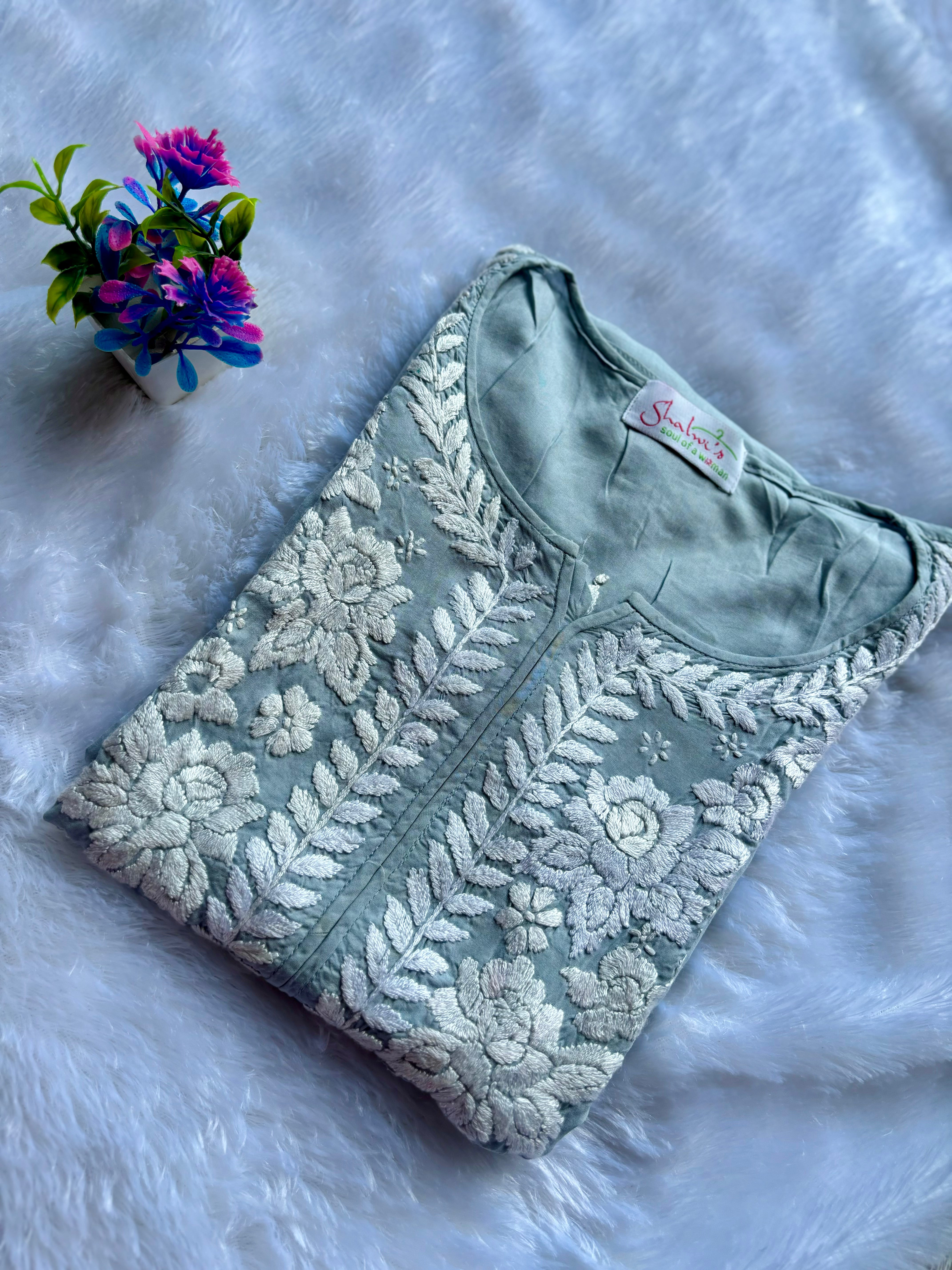 The intricate Chikankari hand work on it enhances the beauty of the Kurti.